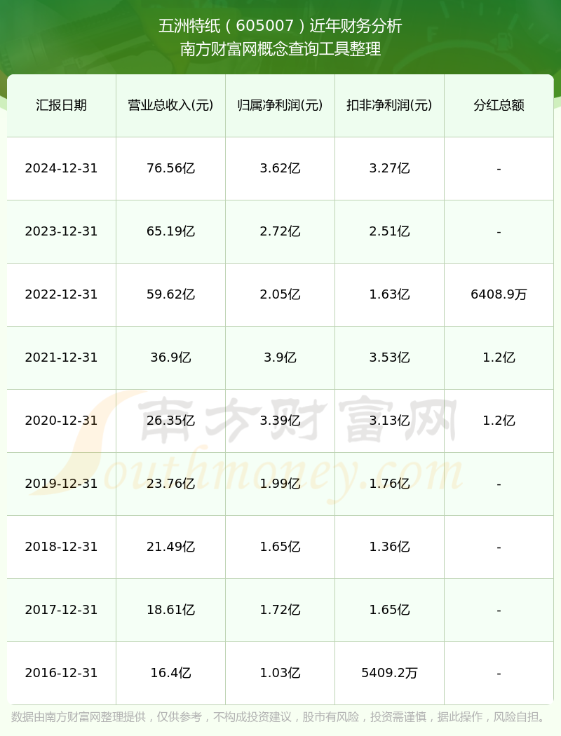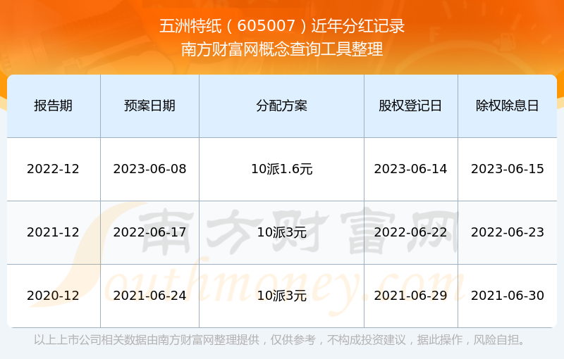五洲特紙最新一次公布的分紅方案為10派1.6元。本次權(quán)益分派股權(quán)登記日為2023年6月14日,除權(quán)除息日為2023年6月15日,派息日為2023年6月15日。