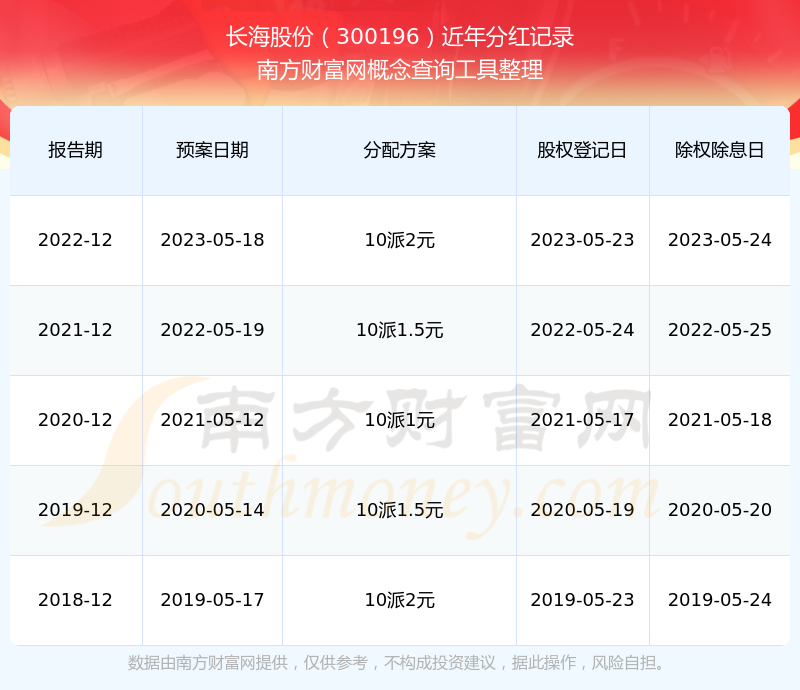 一、長海股份(300196)股票分紅記錄