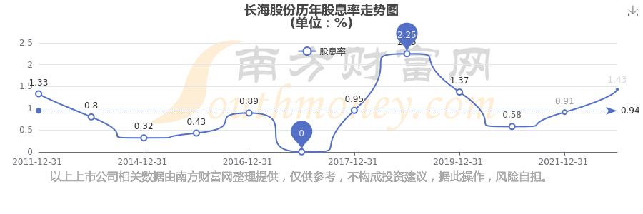 近年長海股份年度股息率走勢如下圖: