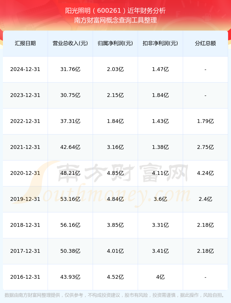 陽(yáng)光照明公司2024年實(shí)現(xiàn)營(yíng)業(yè)收入31.76億元,同比增長(zhǎng)3.27%;凈利潤(rùn)2.03億元,同比增長(zhǎng)-5.73%;毛利率33.4%。