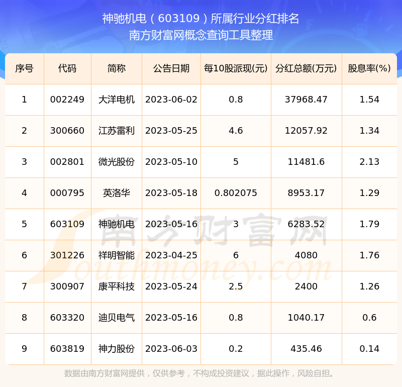 按照南方財富網(wǎng)趨勢選股系統(tǒng)統(tǒng)計,神馳機電所屬行業(yè)為機械設備行業(yè),機械設備行業(yè)分紅排名情況如下表: