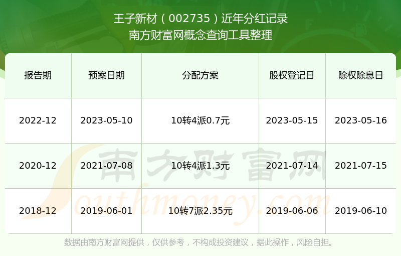 王子新材最新一次公布的分紅方案為10轉(zhuǎn)4派0.7元。本次權(quán)益分派股權(quán)登記日為2023年5月15日,除權(quán)除息日為2023年5月16日,派息日為2023年5月16日。