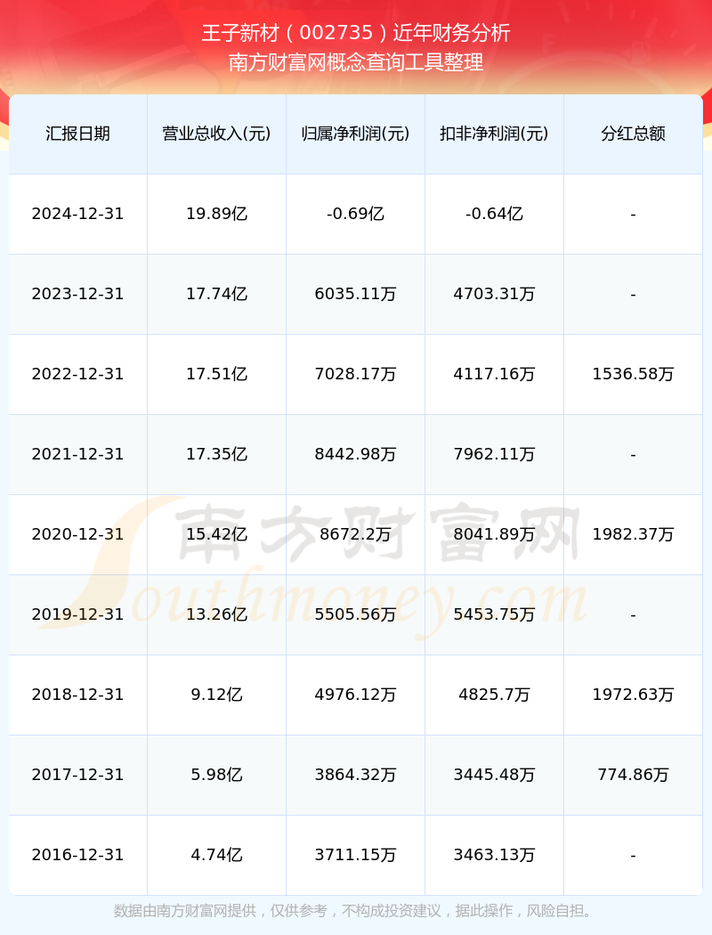 王子新材2024年總營(yíng)收19.89億,同比增長(zhǎng)12.15%;凈利潤(rùn)-6850.25萬(wàn),同比增長(zhǎng)-213.51%;銷(xiāo)售毛利率16.81%。