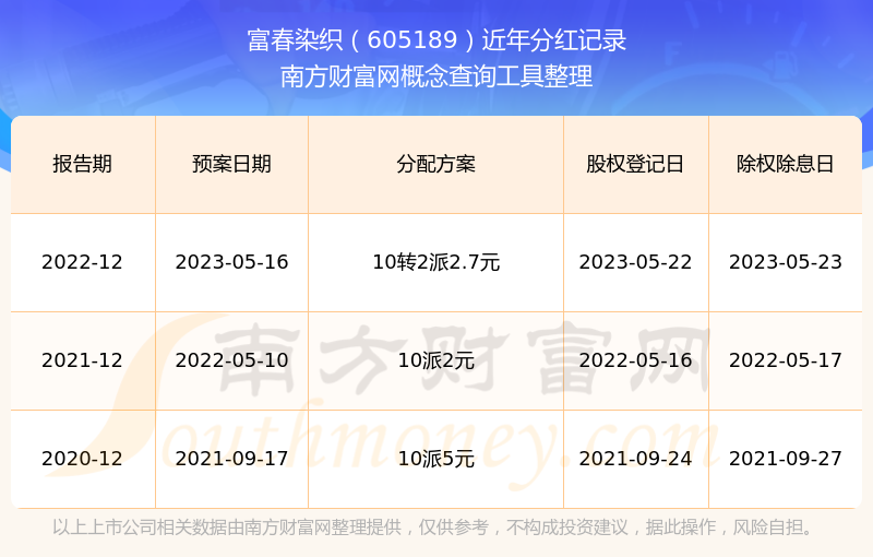 富春染織最新一次公布的分紅方案為10轉(zhuǎn)2派2.7元。本次權(quán)益分派股權(quán)登記日為2023年5月22日,除權(quán)除息日為2023年5月23日,派息日為2023年5月23日。
