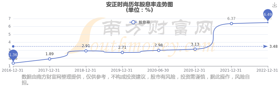 近年安正時(shí)尚年度股息率走勢(shì)如下圖: