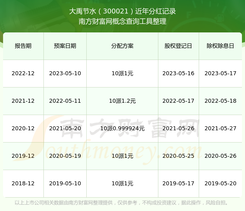 大禹節(jié)水最新一次公布的分紅方案為10派1元。本次權(quán)益分派股權(quán)登記日為2023年5月16日,除權(quán)除息日為2023年5月17日,派息日為2023年5月17日。