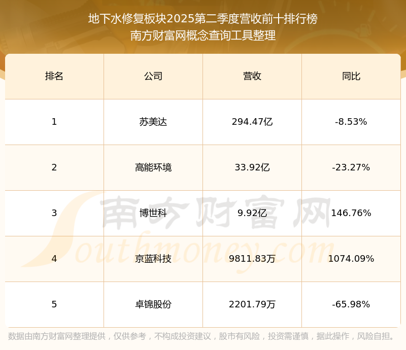 按照南方財(cái)富網(wǎng)概念查詢工具統(tǒng)計(jì),該股所屬板塊為地下水修復(fù)板塊,該板塊共有5只股票,卓錦股份2025第二季度營(yíng)收在該板塊中排名為第5名,該板塊2025第二季度營(yíng)收排名前十的股票如下表: