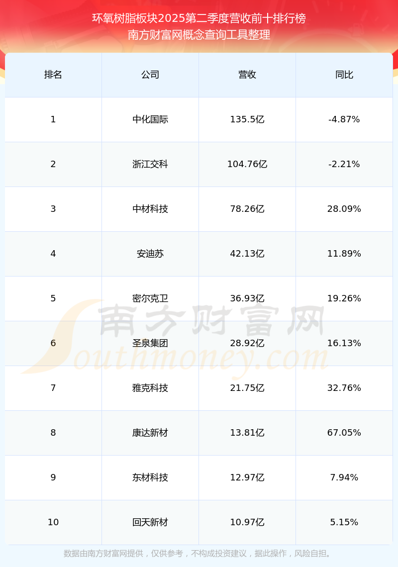 按照南方財富網(wǎng)概念查詢工具統(tǒng)計,該股所屬板塊為環(huán)氧樹脂板塊,該板塊共有22只股票,圣泉集團2025第二季度營收在該板塊中排名為第6名,該板塊2025第二季度營收排名前十的股票如下表: