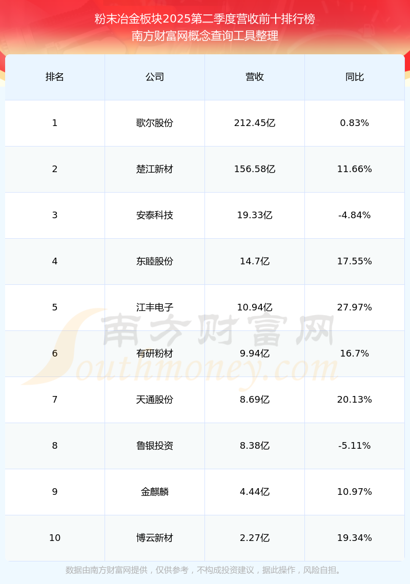 按照南方財富網(wǎng)概念查詢工具統(tǒng)計,該股所屬板塊為粉末冶金板塊,該板塊共有13只股票,東睦股份2025第二季度營收在該板塊中排名為第4名,該板塊2025第二季度營收排名前十的股票如下表: