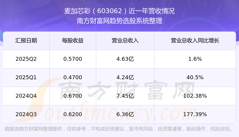 在2025年第二季度,麥加芯彩的業(yè)績表現(xiàn),主營業(yè)務(wù)收入達(dá)到4.63億元,實(shí)現(xiàn)了1.6%的同比增長率。同時(shí),公司歸母凈利潤錄得5995.09萬元,同比增長31.19%。