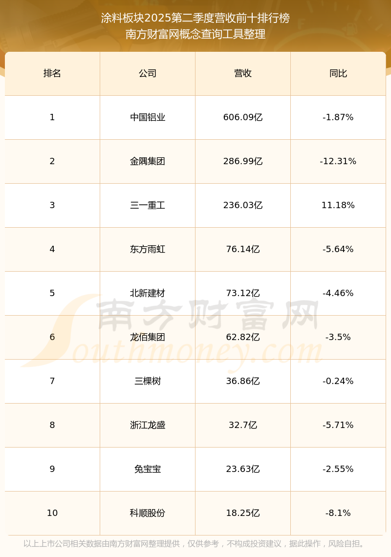 按照南方財(cái)富網(wǎng)概念查詢工具統(tǒng)計(jì),該股所屬板塊為涂料板塊,該板塊共有44只股票,麥加芯彩2025第二季度營收在該板塊中排名為第23名,該板塊2025第二季度營收排名前十的股票如下表: