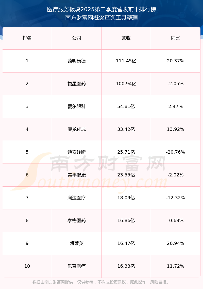 按照南方財(cái)富網(wǎng)概念查詢工具統(tǒng)計(jì),該股所屬板塊為醫(yī)療服務(wù)板塊,該板塊共有77只股票,昭衍新藥2025第二季度營(yíng)收在該板塊中排名為第36名,該板塊2025第二季度營(yíng)收排名前十的股票如下表: