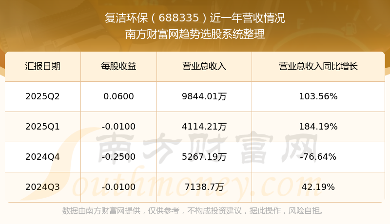 于2025年第二季度,復(fù)潔環(huán)保披露了其業(yè)績表現(xiàn),其中主營業(yè)務(wù)收入9844.01萬元,相較于去年同期103.56%。此外,公司歸屬于母公司的凈利潤為768.86萬元,同比增長了161.24%。在扣除所有非經(jīng)常性損益后,凈利潤-55.36萬元,同比增長96.48%。