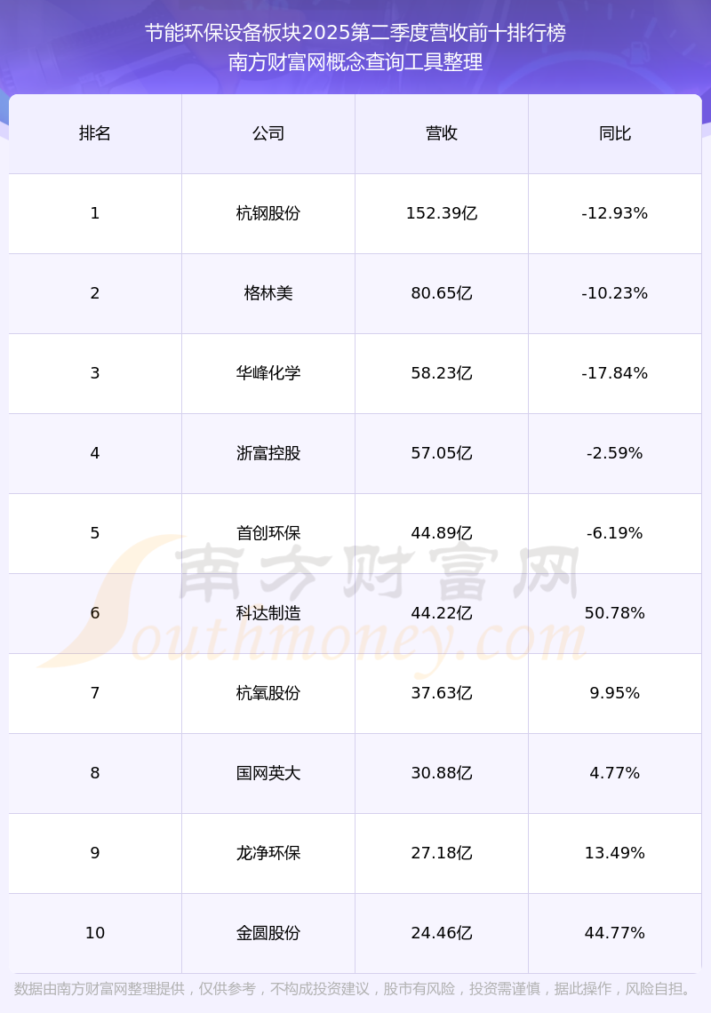 按照南方財富網(wǎng)概念查詢工具統(tǒng)計,該股所屬板塊為節(jié)能環(huán)保設(shè)備板塊,該板塊共有51只股票,復(fù)潔環(huán)保2025第二季度營收在該板塊中排名為第48名,該板塊2025第二季度營收排名前十的股票如下表: