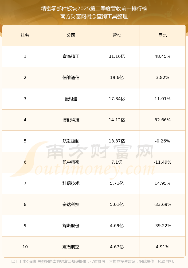 按照南方財(cái)富網(wǎng)概念查詢(xún)工具統(tǒng)計(jì),該股所屬板塊為精密零部件板塊,該板塊共有21只股票,福立旺2025第二季度營(yíng)收在該板塊中排名為第14名,該板塊2025第二季度營(yíng)收排名前十的股票如下表: