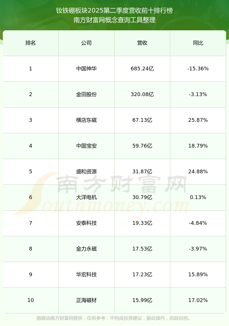 按照南方財(cái)富網(wǎng)概念查詢工具統(tǒng)計(jì),該股所屬板塊為釹鐵硼板塊,該板塊共有23只股票,天和磁材2025第二季度營(yíng)收在該板塊中排名為第15名,該板塊2025第二季度營(yíng)收排名前十的股票如下表: