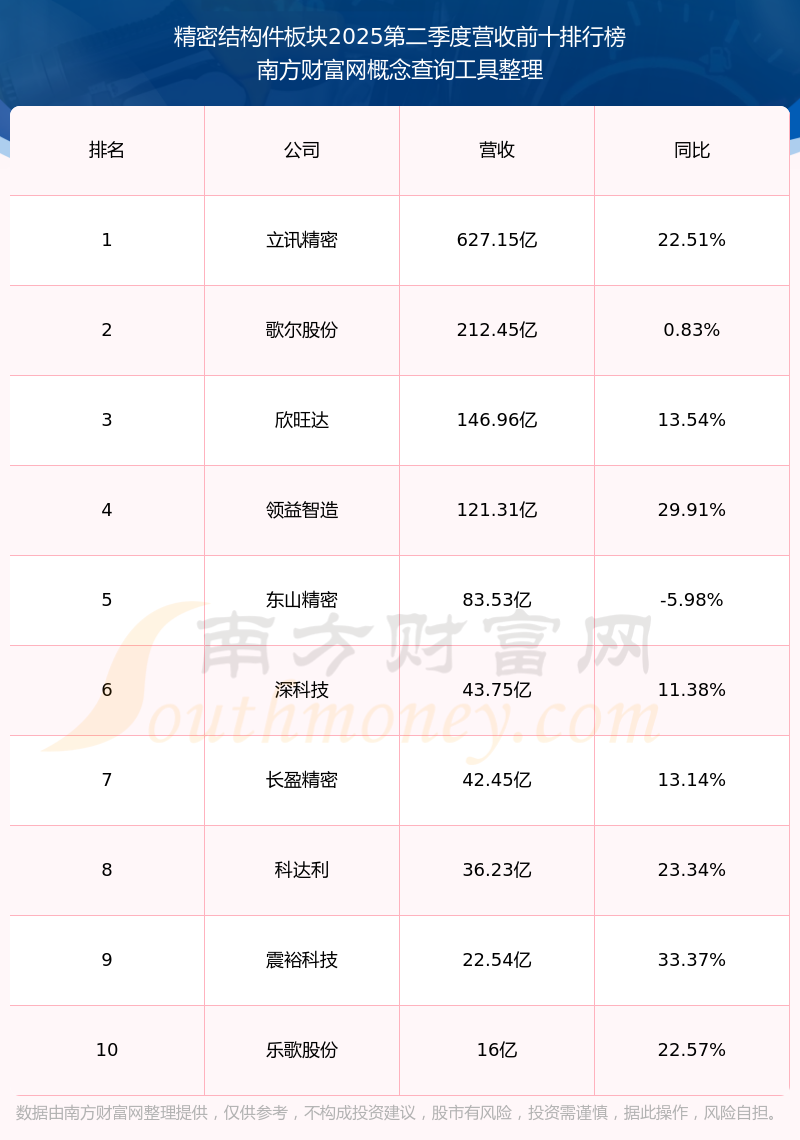 按照南方財(cái)富網(wǎng)概念查詢工具統(tǒng)計(jì),該股所屬板塊為精密結(jié)構(gòu)件板塊,該板塊共有47只股票,邁信林2025第二季度營(yíng)收在該板塊中排名為第47名,該板塊2025第二季度營(yíng)收排名前十的股票如下表: