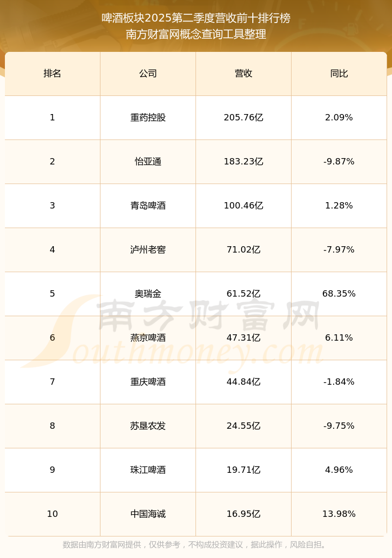 按照南方財富網(wǎng)概念查詢工具統(tǒng)計,該股所屬板塊為啤酒板塊,該板塊共有27只股票,青島啤酒2025第二季度營收在該板塊中排名為第3名,該板塊2025第二季度營收排名前十的股票如下表: