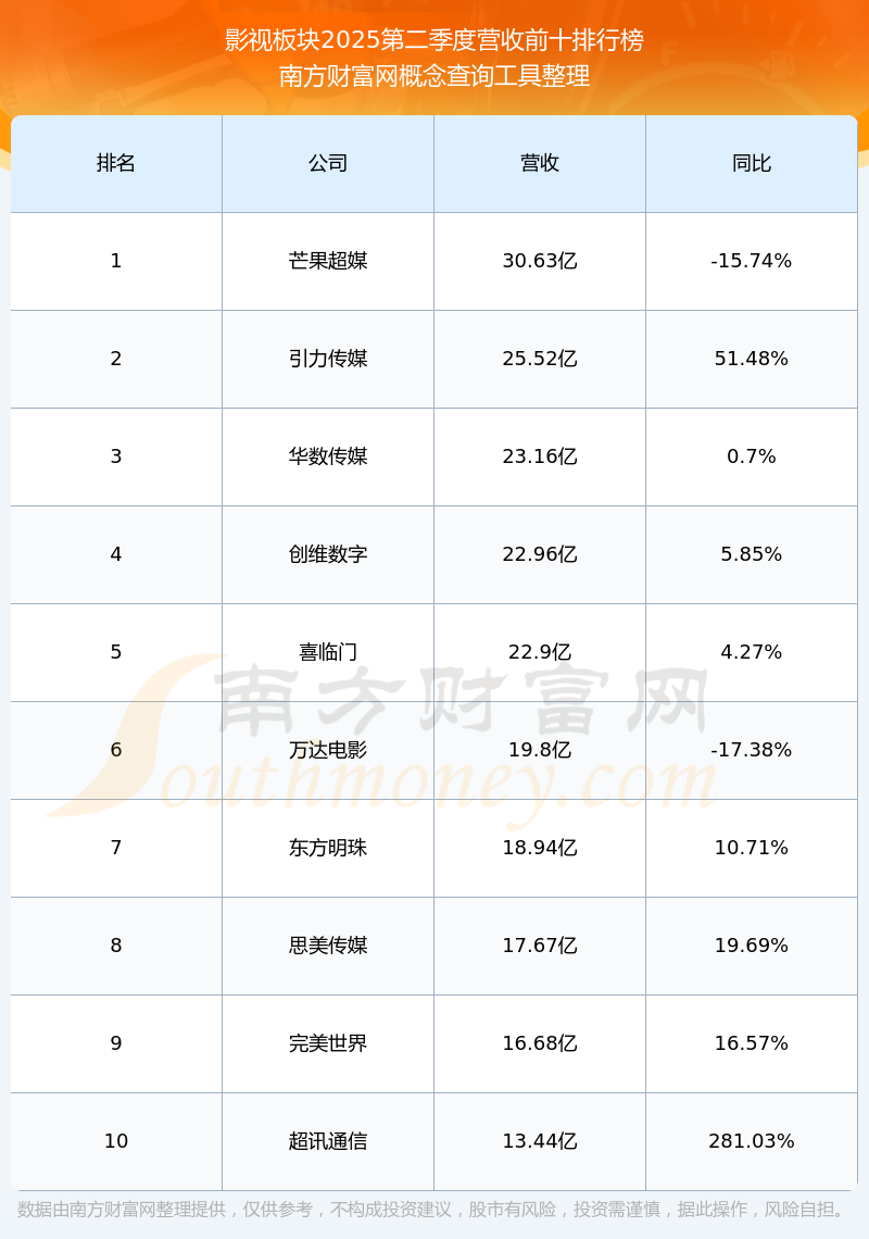 按照南方財(cái)富網(wǎng)概念查詢工具統(tǒng)計(jì),該股所屬板塊為影視板塊,該板塊共有77只股票,中視傳媒2025第二季度營收在該板塊中排名為第56名,該板塊2025第二季度營收排名前十的股票如下表: