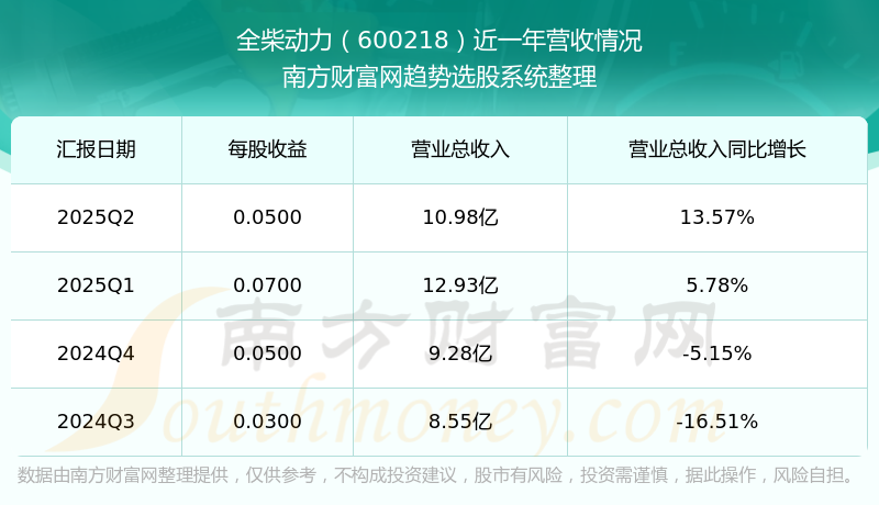 全柴動(dòng)力2025年第二季度財(cái)報(bào)顯示,公司主營(yíng)收入10.98億元,同比13.57%;歸母凈利潤(rùn)2342.78萬(wàn)元,同比-1.18%;扣非凈利潤(rùn)1758.6萬(wàn)元,同比12.65%;