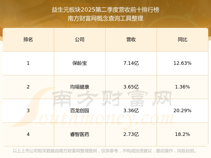 按照南方財富網概念查詢工具統(tǒng)計,該股所屬板塊為益生元板塊,該板塊共有4只股票,百龍創(chuàng)園2025第二季度營收在該板塊中排名為第3名,該板塊2025第二季度營收排名前十的股票如下表: