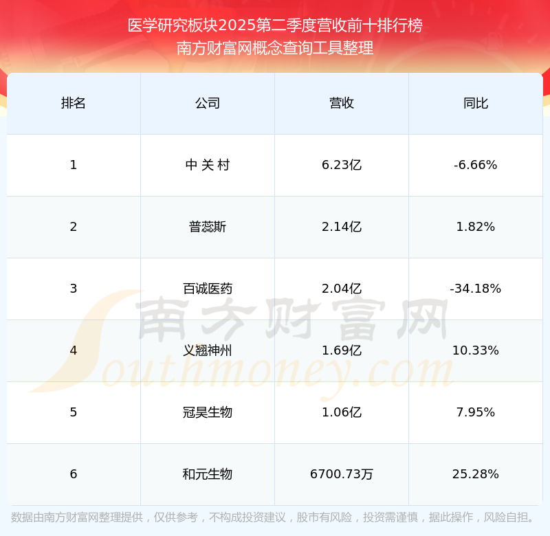 按照南方財(cái)富網(wǎng)概念查詢工具統(tǒng)計(jì),該股所屬板塊為醫(yī)學(xué)研究板塊,該板塊共有6只股票,諾禾致源2025第二季度營(yíng)收在該板塊中排名為第6名,該板塊2025第二季度營(yíng)收排名前十的股票如下表: