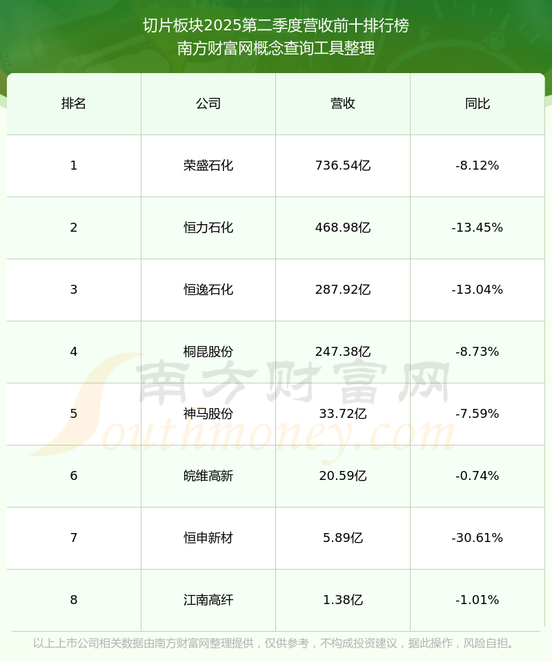 按照南方財(cái)富網(wǎng)概念查詢工具統(tǒng)計(jì),該股所屬板塊為切片板塊,該板塊共有8只股票,聚合順2025第二季度營(yíng)收在該板塊中排名為第8名,該板塊2025第二季度營(yíng)收排名前十的股票如下表: