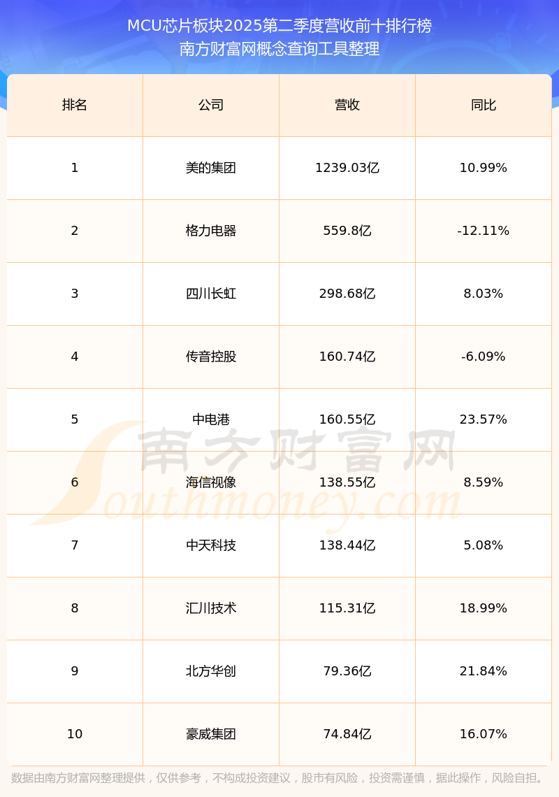 按照南方財(cái)富網(wǎng)概念查詢工具統(tǒng)計(jì),該股所屬板塊為MCU芯片板塊,該板塊共有114只股票,芯?萍2025第二季度營收在該板塊中排名為第93名,該板塊2025第二季度營收排名前十的股票如下表: