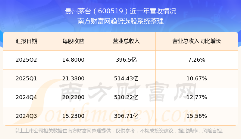 貴州茅臺2025年第二季度財報顯示,公司主營收入396.5億元,同比7.26%;歸母凈利潤185.55億元,同比5.25%;扣非凈利潤185.4億元,同比5.23%。