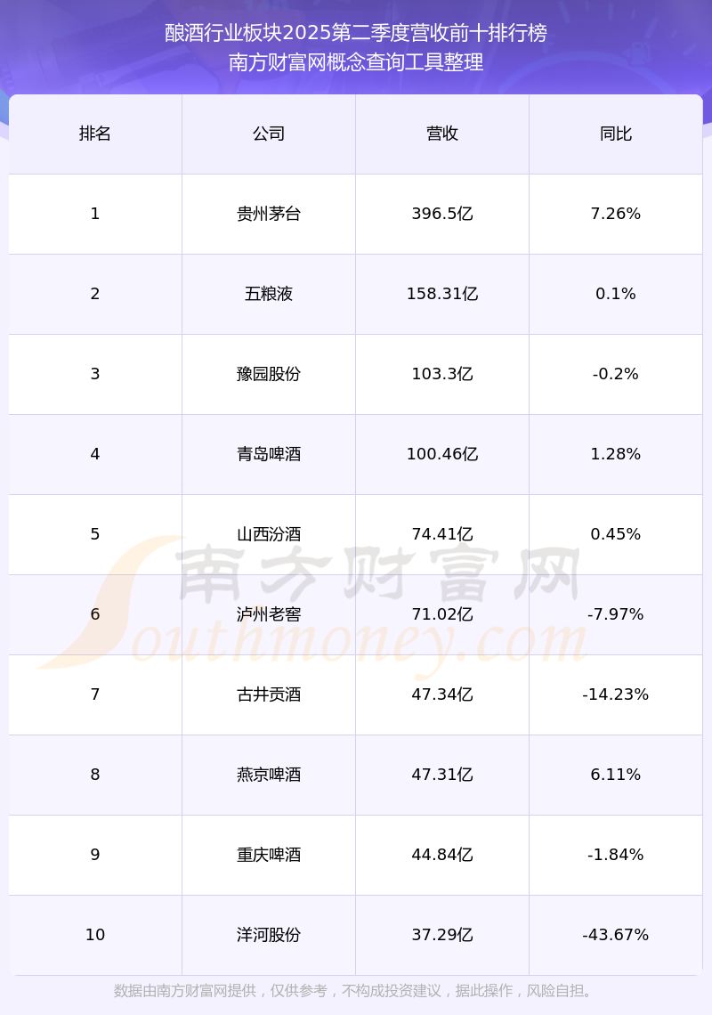 按照南方財富網(wǎng)概念查詢工具統(tǒng)計,該股所屬板塊為釀酒行業(yè)板塊,該板塊共有42只股票,貴州茅臺2025第二季度營收在該板塊中排名為第1名,該板塊2025第二季度營收排名前十的股票如下表: