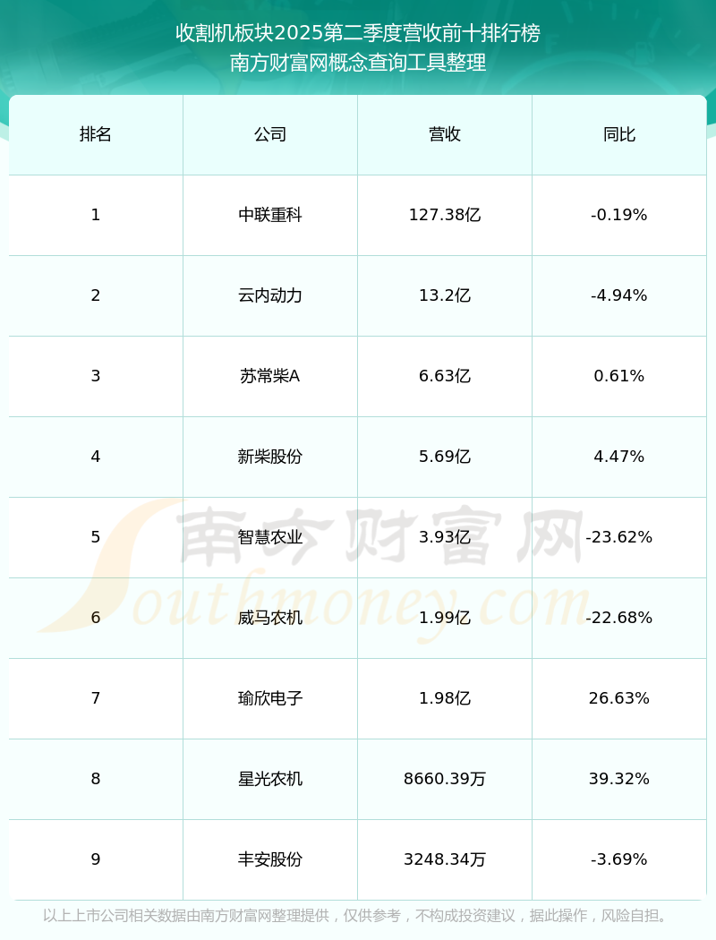 按照南方財富網(wǎng)概念查詢工具統(tǒng)計,該股所屬板塊為收割機板塊,該板塊共有9只股票,星光農(nóng)機2025第二季度營收在該板塊中排名為第8名,該板塊2025第二季度營收排名前十的股票如下表: