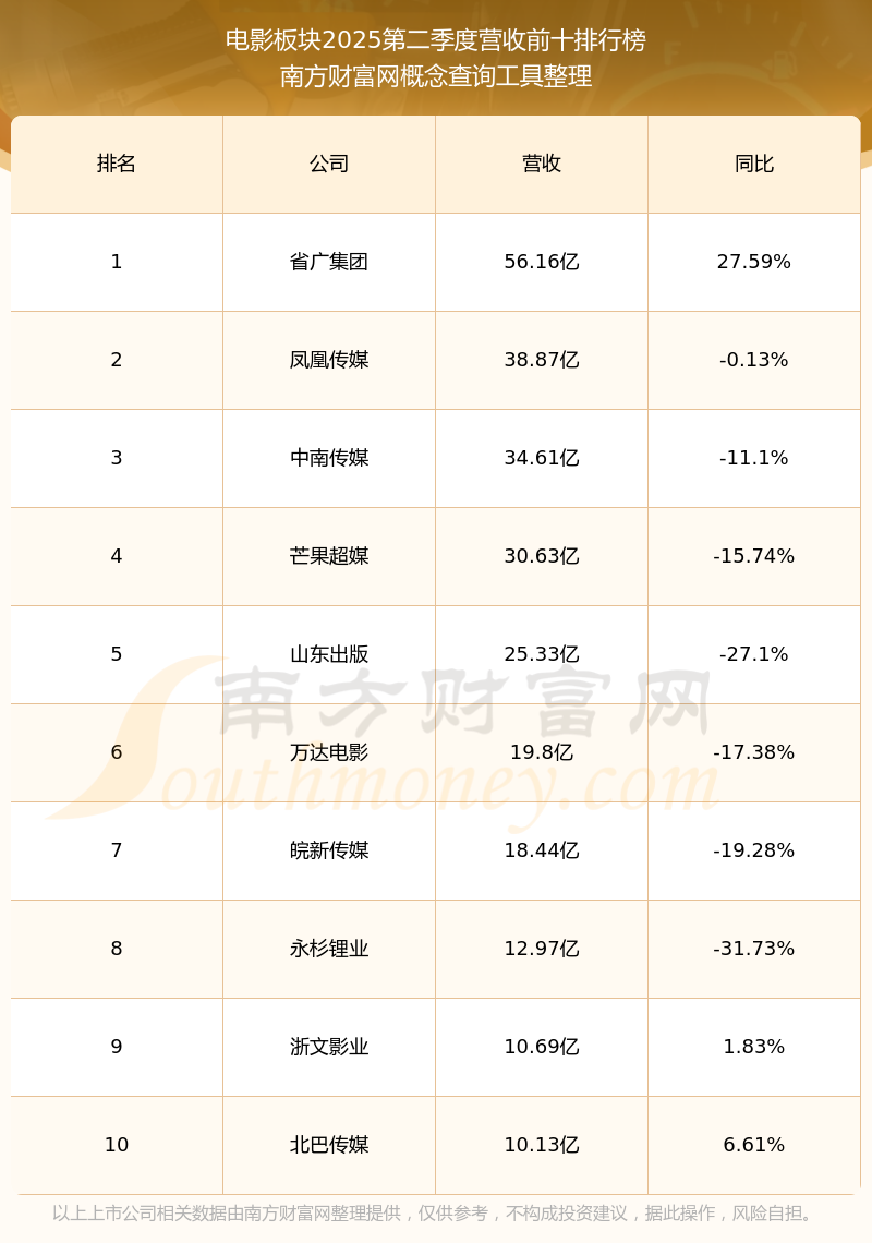 按照南方財富網(wǎng)概念查詢工具統(tǒng)計,該股所屬板塊為電影板塊,該板塊共有44只股票,中國電影2025第二季度營收在該板塊中排名為第12名,該板塊2025第二季度營收排名前十的股票如下表: