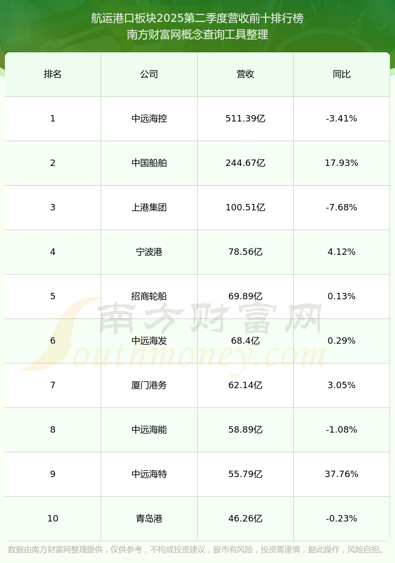 按照南方財(cái)富網(wǎng)概念查詢工具統(tǒng)計(jì),該股所屬板塊為航運(yùn)港口板塊,該板塊共有42只股票,渤海輪渡2025第二季度營收在該板塊中排名為第33名,該板塊2025第二季度營收排名前十的股票如下表: