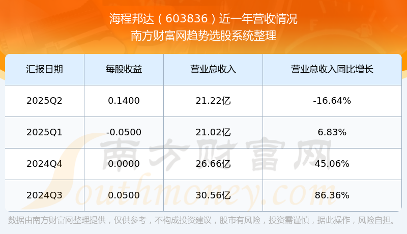 海程邦達(dá)2025年第二季度顯示,公司主營收入21.22億元,同比-16.64%;歸母凈利潤2745.4萬元,同比-31.61%;扣非凈利潤1757.17萬元,同比-58.44%。