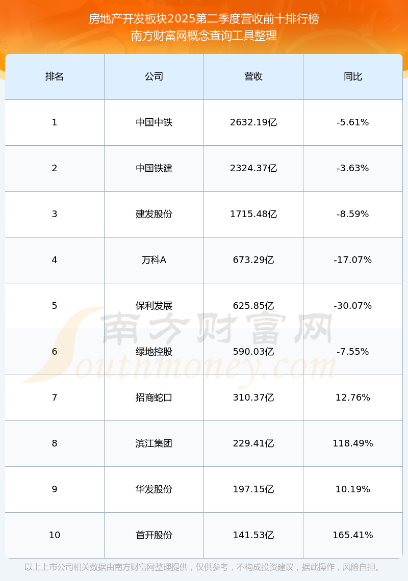 按照南方財(cái)富網(wǎng)概念查詢工具統(tǒng)計(jì),該股所屬板塊為房地產(chǎn)開發(fā)板塊,該板塊共有143只股票,福瑞達(dá)2025第二季度營收在該板塊中排名為第55名,該板塊2025第二季度營收排名前十的股票如下表: