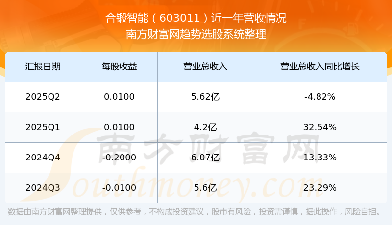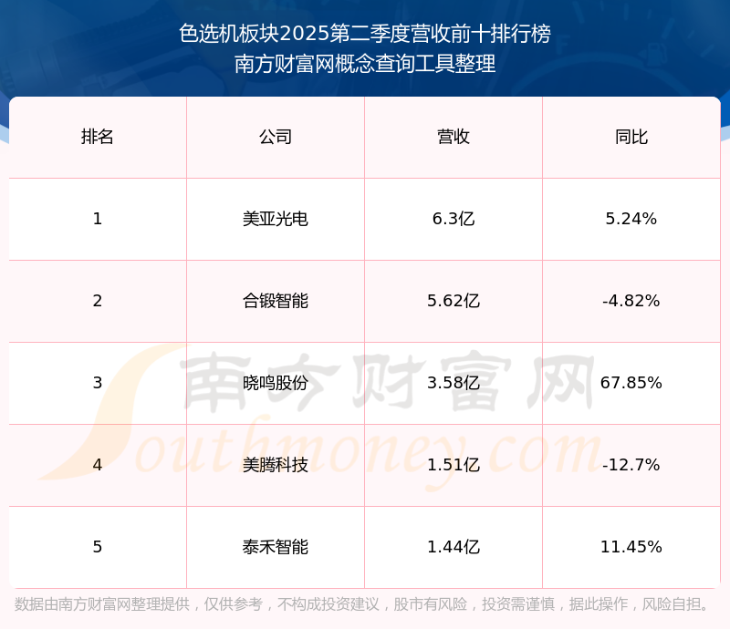 按照南方財(cái)富網(wǎng)概念查詢工具統(tǒng)計(jì),該股所屬板塊為色選機(jī)板塊,該板塊共有5只股票,合鍛智能2025第二季度營收在該板塊中排名為第2名,該板塊2025第二季度營收排名前十的股票如下表: