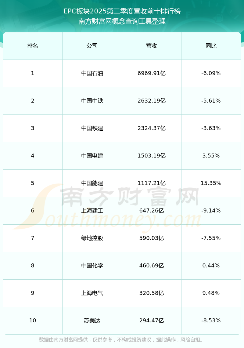 按照南方財(cái)富網(wǎng)概念查詢工具統(tǒng)計(jì),該股所屬板塊為EPC板塊,該板塊共有151只股票,偉明環(huán)保2025第二季度營收在該板塊中排名為第151名,該板塊2025第二季度營收排名前十的股票如下表: