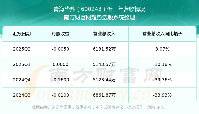 在2025年第二季度,青海華鼎的業(yè)績(jī)表現(xiàn),主營(yíng)業(yè)務(wù)收入達(dá)到6131.52萬(wàn)元,實(shí)現(xiàn)了3.07%的同比增長(zhǎng)率。同時(shí),公司歸母凈利潤(rùn)錄得-137.36萬(wàn)元,同比增長(zhǎng)77.91%。