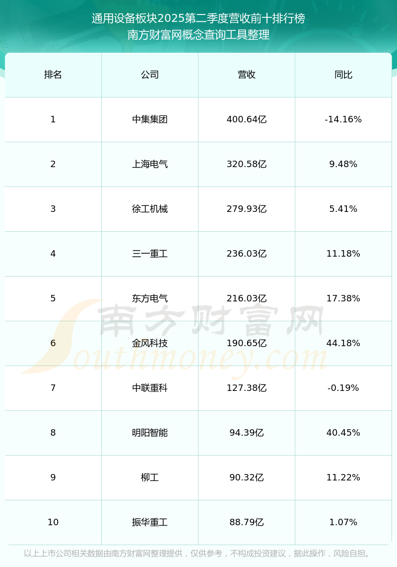 按照南方財(cái)富網(wǎng)概念查詢工具統(tǒng)計(jì),該股所屬板塊為通用設(shè)備板塊,該板塊共有423只股票,青海華鼎2025第二季度營(yíng)收在該板塊中排名為第389名,該板塊2025第二季度營(yíng)收排名前十的股票如下表: