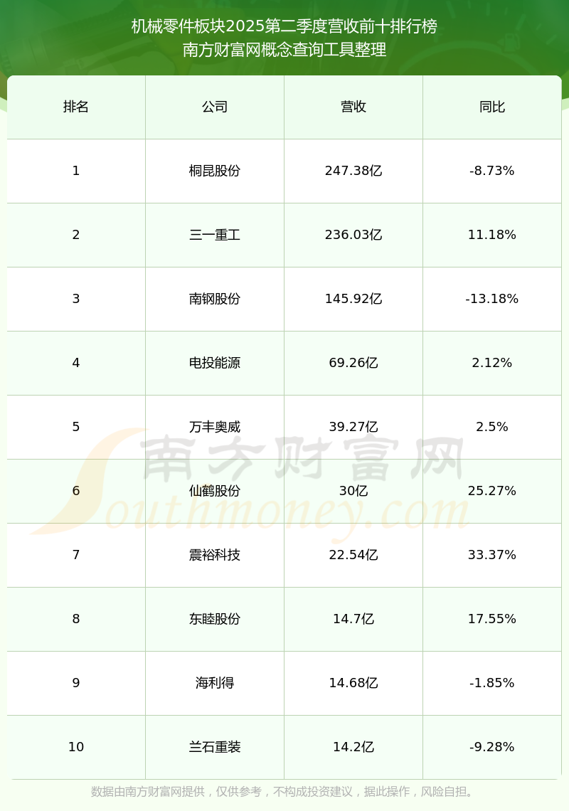 按照南方財(cái)富網(wǎng)概念查詢工具統(tǒng)計(jì),該股所屬板塊為機(jī)械零件板塊,該板塊共有34只股票,紐威股份2025第二季度營(yíng)收在該板塊中排名為第34名,該板塊2025第二季度營(yíng)收排名前十的股票如下表:
