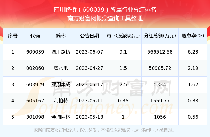 按照南方財富網(wǎng)趨勢選股系統(tǒng)統(tǒng)計,四川路橋所屬行業(yè)為工程施工行業(yè),工程施工行業(yè)分紅排名情況如下表: