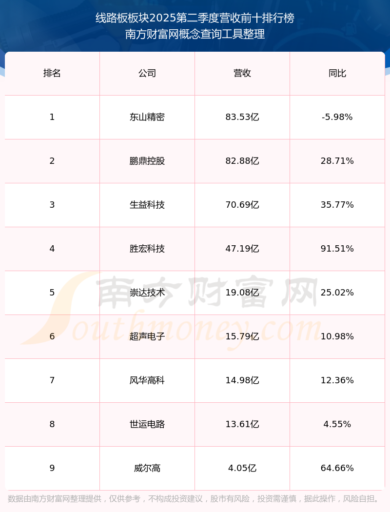 按照南方財(cái)富網(wǎng)概念查詢工具統(tǒng)計(jì),該股所屬板塊為線路板板塊,該板塊共有9只股票,依頓電子2025第二季度營(yíng)收在該板塊中排名為第9名,該板塊2025第二季度營(yíng)收排名前十的股票如下表: