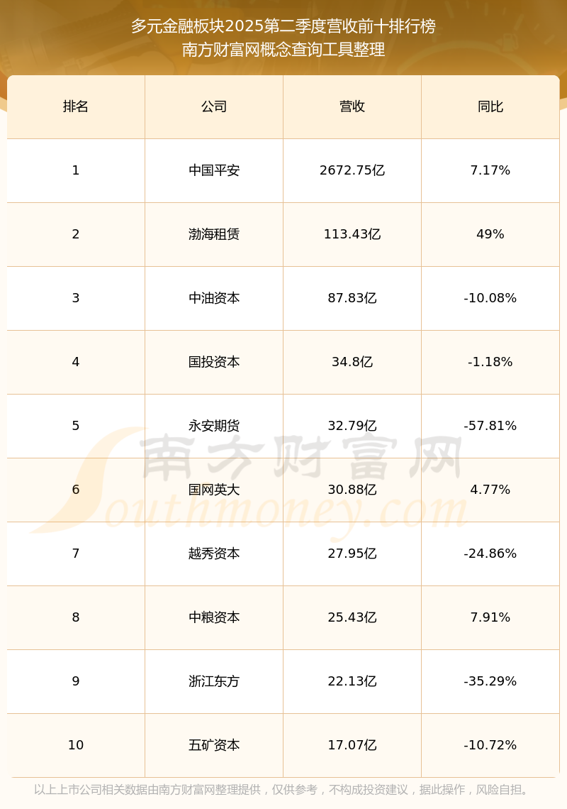按照南方財富網(wǎng)概念查詢工具統(tǒng)計,該股所屬板塊為多元金融板塊,該板塊共有35只股票,建元信托2025第二季度營收在該板塊中排名為第28名,該板塊2025第二季度營收排名前十的股票如下表:
