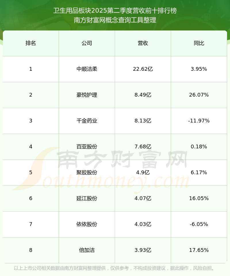 按照南方財(cái)富網(wǎng)概念查詢工具統(tǒng)計(jì),該股所屬板塊為衛(wèi)生用品板塊,該板塊共有8只股票,豪悅護(hù)理2025第二季度營(yíng)收在該板塊中排名為第2名,該板塊2025第二季度營(yíng)收排名前十的股票如下表: