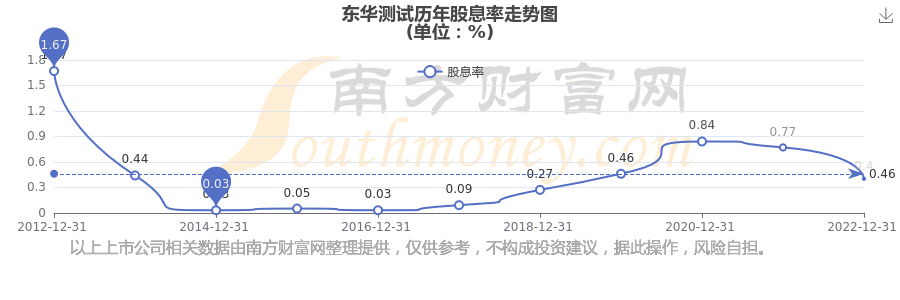 近年?yáng)|華測(cè)試年度股息率走勢(shì)如下圖: