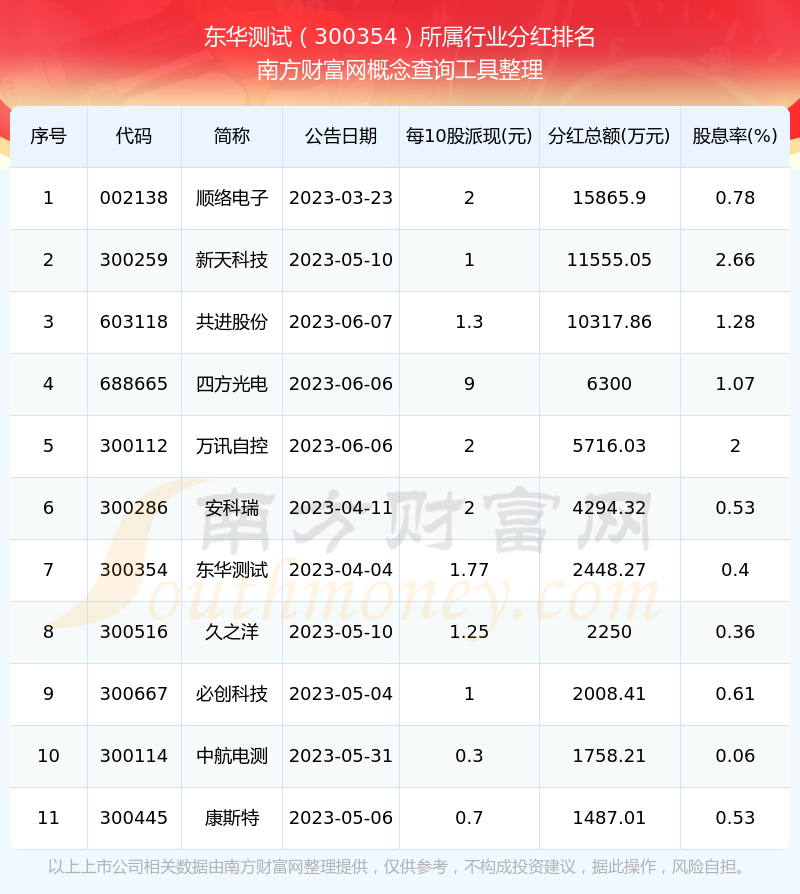 按照南方財(cái)富網(wǎng)趨勢(shì)選股系統(tǒng)統(tǒng)計(jì),東華測(cè)試所屬行業(yè)為儀器儀表行業(yè),儀器儀表行業(yè)分紅排名情況如下表: