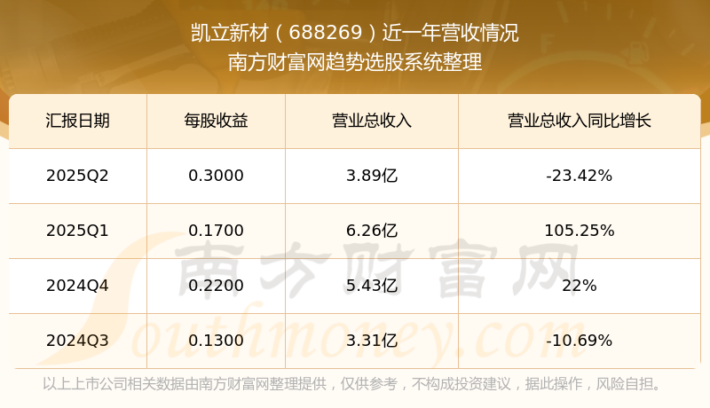 凱立新材(688269)發(fā)布2025年第二季度財報。2025年第二季度凱立新材實現(xiàn)營業(yè)收入3.89億元,同比增加-23.42元%,環(huán)比增加-37.89%;凈利潤為3929.57萬元,同比增長11.38%,環(huán)比增長79.44%。