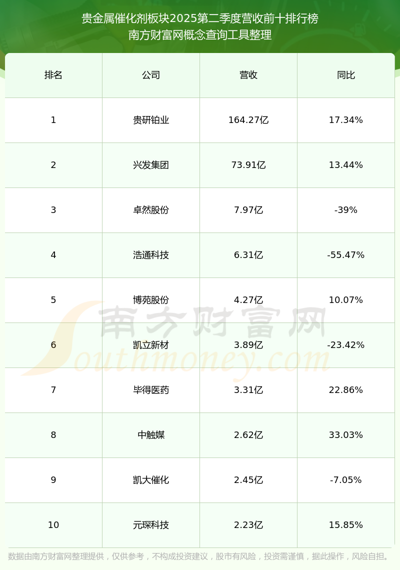按照南方財富網(wǎng)概念查詢工具統(tǒng)計,該股所屬板塊為貴金屬催化劑板塊,該板塊共有11只股票,凱立新材2025第二季度營收在該板塊中排名為第6名,該板塊2025第二季度營收排名前十的股票如下表: