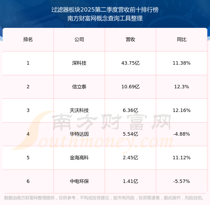 按照南方財富網(wǎng)概念查詢工具統(tǒng)計,該股所屬板塊為過濾器板塊,該板塊共有6只股票,美?萍2025第二季度營收在該板塊中排名為第6名,該板塊2025第二季度營收排名前十的股票如下表: