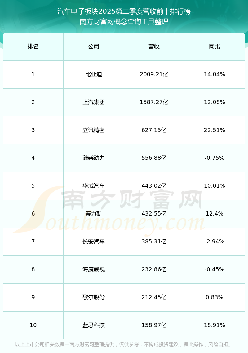 按照南方財(cái)富網(wǎng)概念查詢工具統(tǒng)計(jì),該股所屬板塊為汽車電子板塊,該板塊共有228只股票,道通科技2025第二季度營收在該板塊中排名為第92名,該板塊2025第二季度營收排名前十的股票如下表: